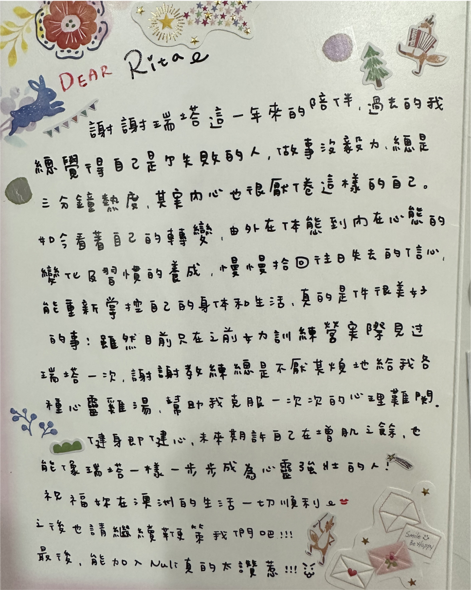 直到遇見了現在的教練才讓她重新喜歡自己,她甚至寫了卡片感謝教練對她的幫助